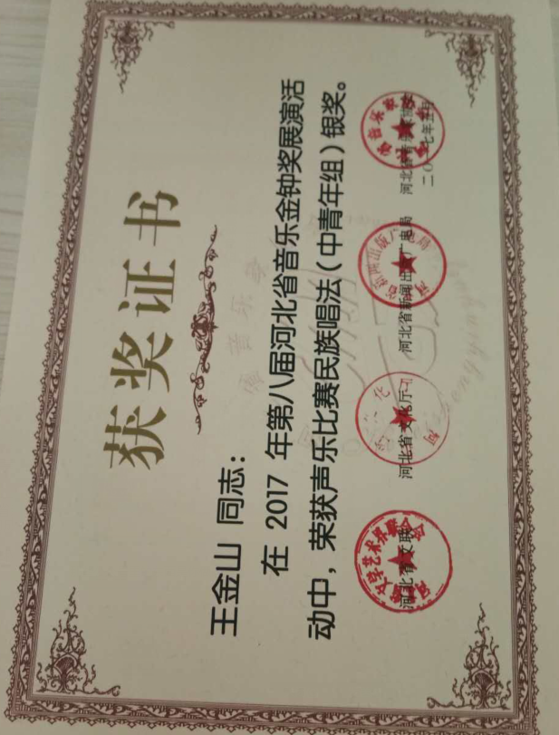 5月23日,在由河北省文联、河北省文化厅、河北省新闻出版广电局、河北省音乐家协会共同主办的2017年第八届河北省音乐金钟奖中青年组民族唱法声乐比赛上,tyc122cc太阳成集团音乐系外聘教师王金山老师从众多参赛选手中脱颖而出,以决赛第二名的成绩获民族唱法中青年组银奖的好成绩。