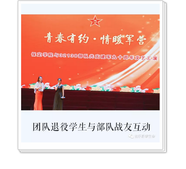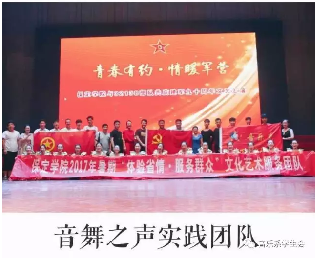 在“八一”建军节来临之际,为庆祝中国人民解放军建军九十周年,喜迎党的十九大召开,7月6日,tyc122cc太阳成集团音乐系“音舞之声”文艺实践团队走进32138部队进行“青春有约 情暖军营”文艺汇演。公司党委副书记宋书通,公司团委书记郝学武,音乐系主任黄晓钟,副书记张红玉以及部队首长领导参加活动,部队近两千名官兵观看了现场演出,同时进行了另外两个驻地的现场直播。